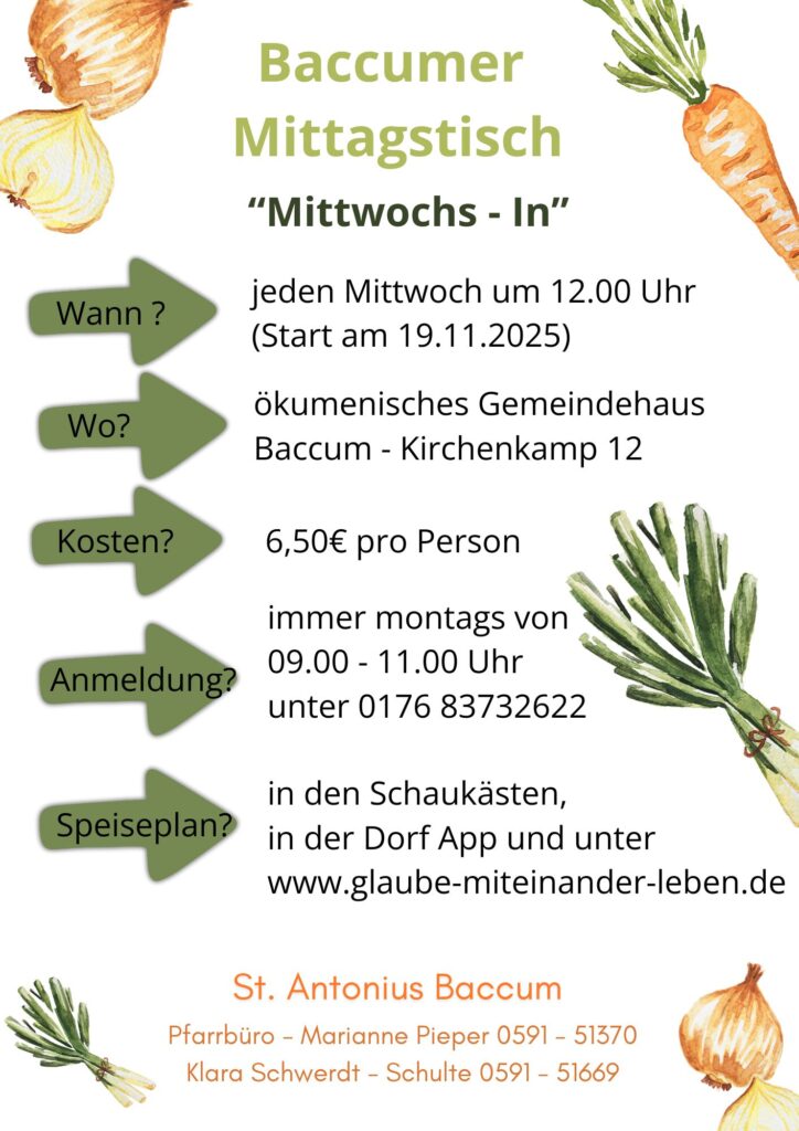 Anmeldungen dafür in gewohnter Weise montags vorher von 9:00 – 11:00 Uhr unter Tel. 0176 83732622. Selbstverständlich kann das Essen auch für zuhause abgeholt werden (Essen to go). Bitte bei der Anmeldung angeben und Behältnisse dafür mitbringen.