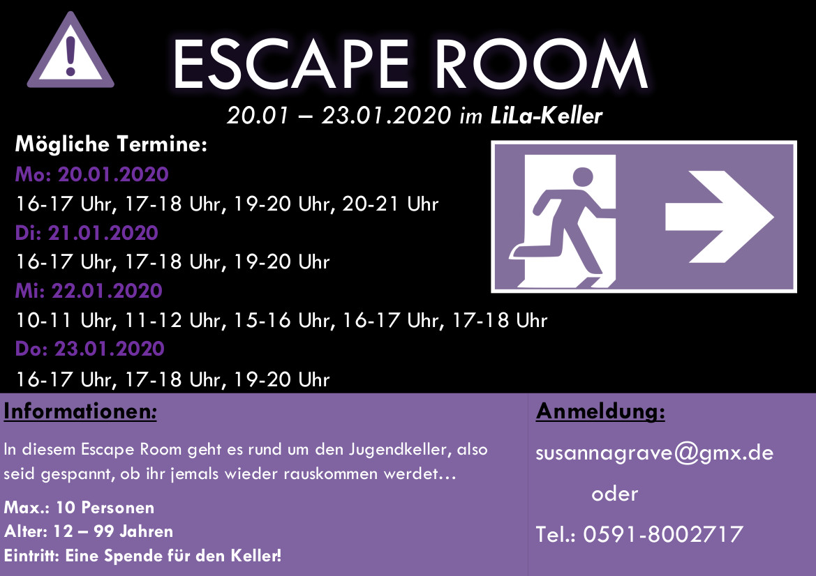 Nachdem wir in diesem Jahr den „Escape room Odyssee nach Ninive“ in der Firmvorbereitung und beim Pfarrfest angeboten haben, haben wir für 2020 einen neuen „Escape room“ für Sie vorbereitet: (mehr …)