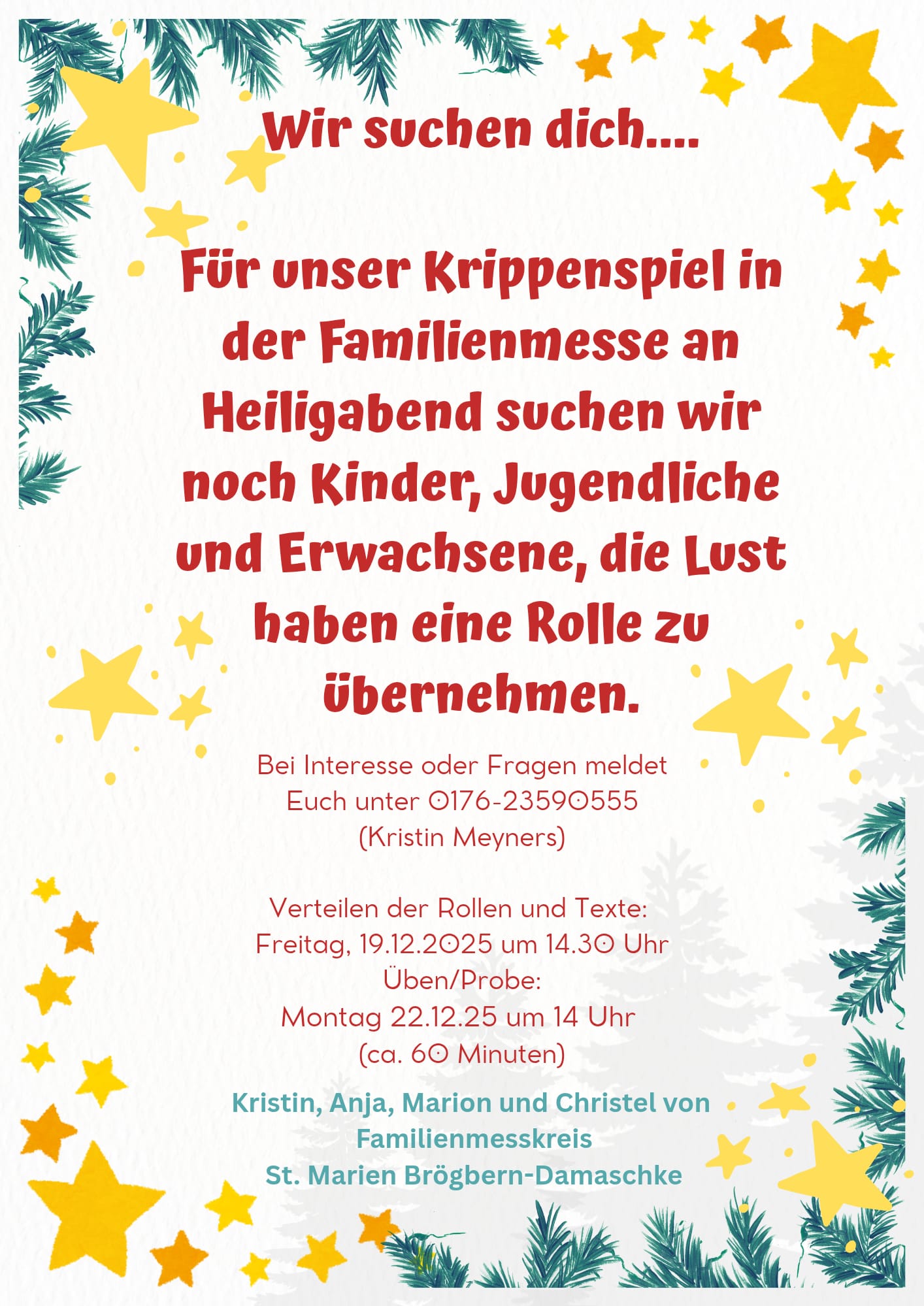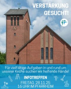 Wenn du Freude daran hast, kleine Aufgaben zu übernehmen, laden wir Dich herzlich zu einem unverbindlichen Infotermin am Freitag, 28.11.2025 um 16.00 Uhr im Pfarrheim in Brögbern, ein. Hier werden wir die unterschiedlichen Aufgaben vorstellen und deine Fragen beantworten. Engagier dich! Weil keiner alles, aber jeder etwas tun kann.