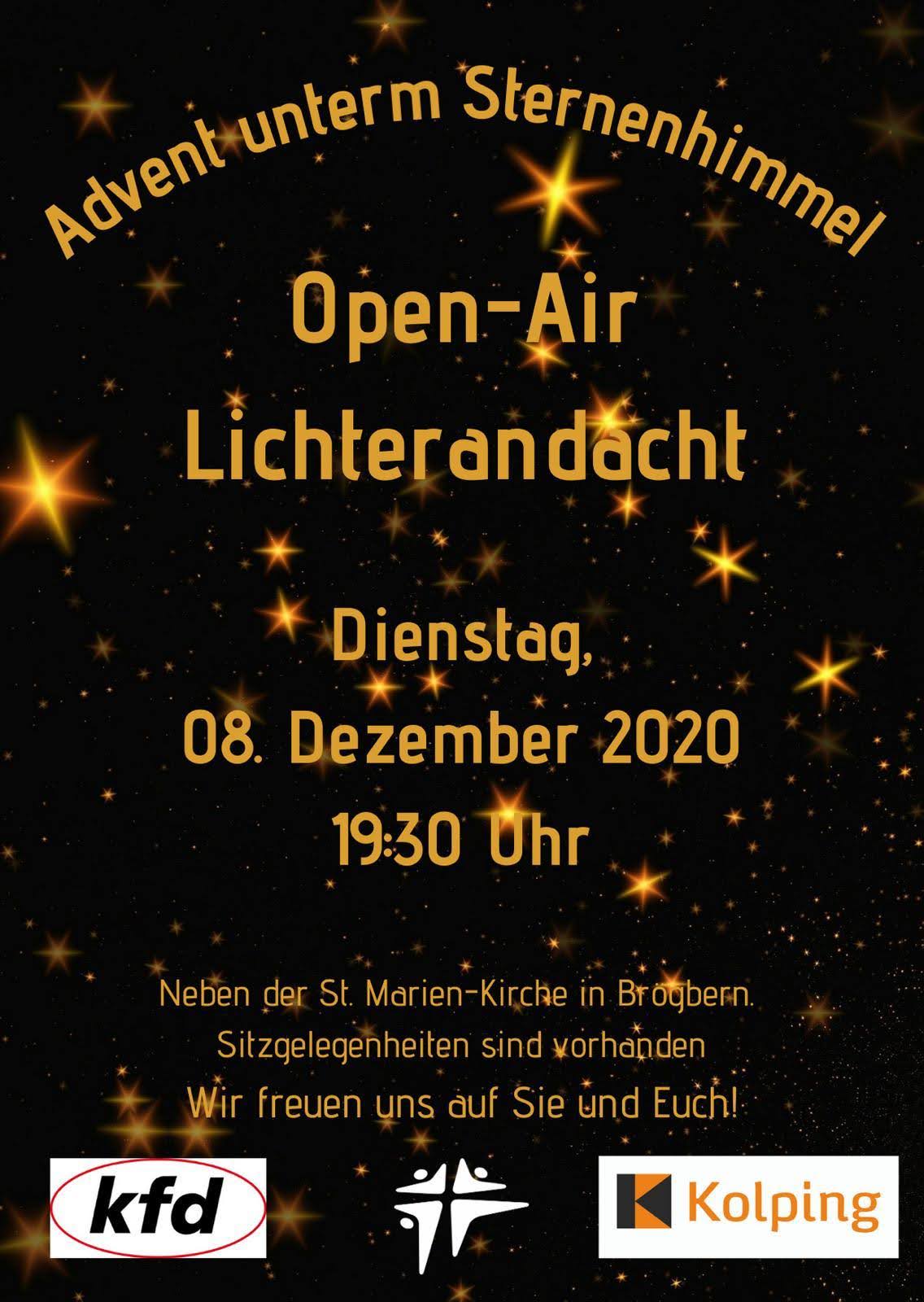 vent unterm SternenhimmelIn diesem Jahr laden Kolping und kfd gemeinsam herzlich ein zur Open-Air-Lichterandacht „Advent unterm Sternenhimmel“ am Di., 8.12., um 19:30 Uhr neben unserer Kirche. Sitzgelegenheiten sind vorhanden. Bei besinnlichen Texten und schöner Musik haben wir gleich mehrfach Grund miteinander zu feiern: