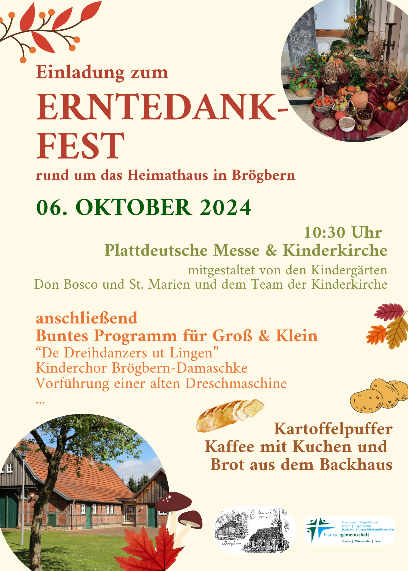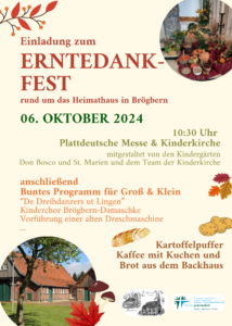 Am Sonntag, den 6.10. feiern wir um 10:30 Uhr unseren Sonntagsgottesdienst als Plattdeutsche Messe beim Heimathaus. Die Kleinsten feiern parallel die Kinderkirche. Rund um das Heimathaus wartet anschließend ein buntes Programm auf Groß & Klein! Herzliche Einladung!