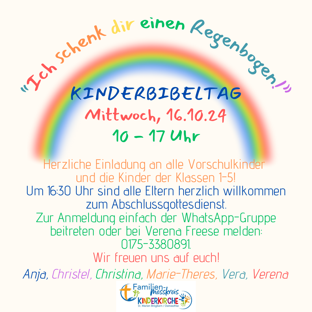 Nach dem tollen Erfolg vom letzten Jahr laden wir wieder herzlich ein zu einem Kinderbibeltag in den Herbstferien am Mittwoch, 16.10. von 10-17 Uhr! Unter dem Motto „Ich schenk dir einen Regenbogen!“ wollen wir mit den Kindern (Vorschulkinder – 5. Klasse) spielen, reden, singen und kreativ sein! Für weitere Infos und zur Anmeldung gerne bei Verena Freese melden: 0175-3380891.