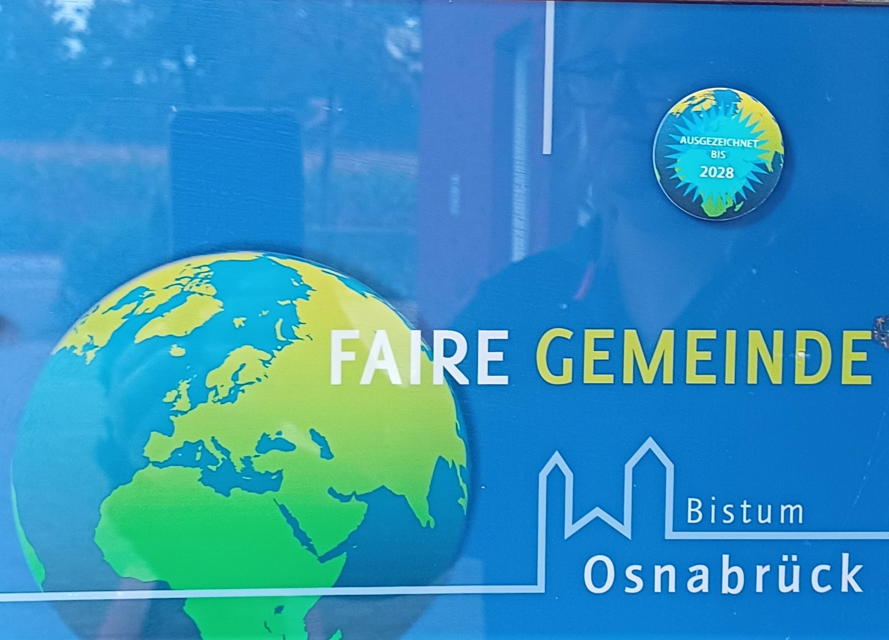 Am 04.10.2014 wurde unserer Kirchengemeinde in einem feierlichen Gottesdienst durch eine Vertreterin des Bistums Osnabrück die Zertifizierung zur Fairen Gemeinde überreicht. Vielleicht erinnert sich der eine oder die andere noch daran. Seitdem weist ein Schild an unserem Pfarrheim darauf hin, dass wir diese Verpflichtung eingegangen sind.