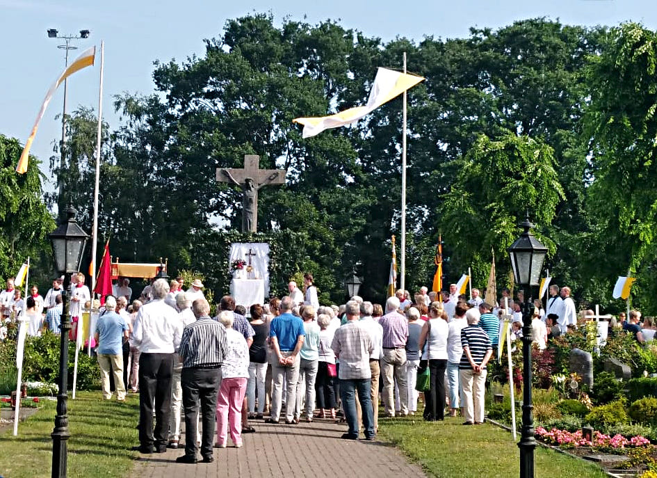 Die Prozession am Fest Fronleichnam ist einfach nicht alltäglich! Kirche setzt sich in Bewegung, geht raus auf die Straße, feiert unterwegs Jesus selbst im Brot des Lebens und den Glauben an Gott, der bei uns ist – in unserem Alltag und mitten im Ortsteil. Dafür stehen beispielhaft die drei Stationen auf dem Friedhof, zwischen Rewe und Sportplatz und an der Overbergschule.