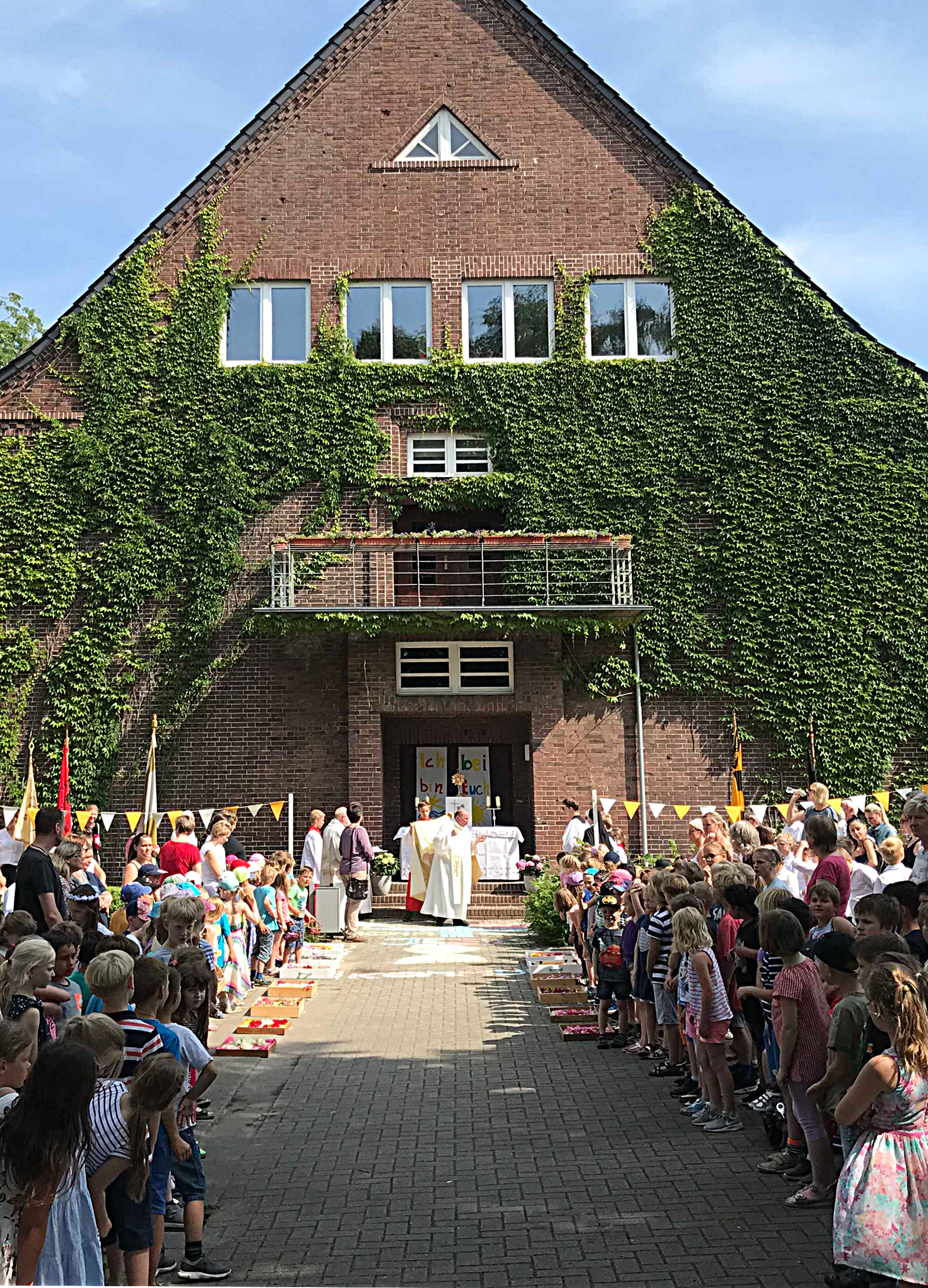 Mit den Blumenkästen der Kindergartenkinder und den Bild der Kommunionkinder war der Altar der Overbergschule bunt geschmückt. Schön war es, dass die Schulkinder der Overbergschule die Prozession noch zum Abschluss in die Kirche begleiteten.