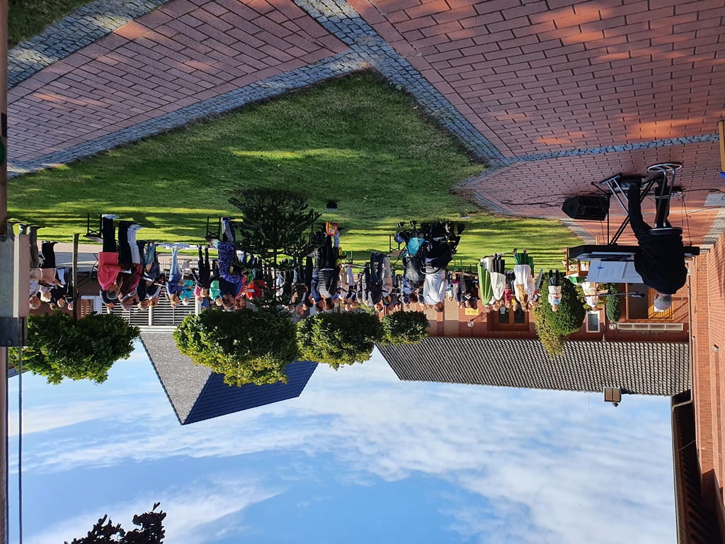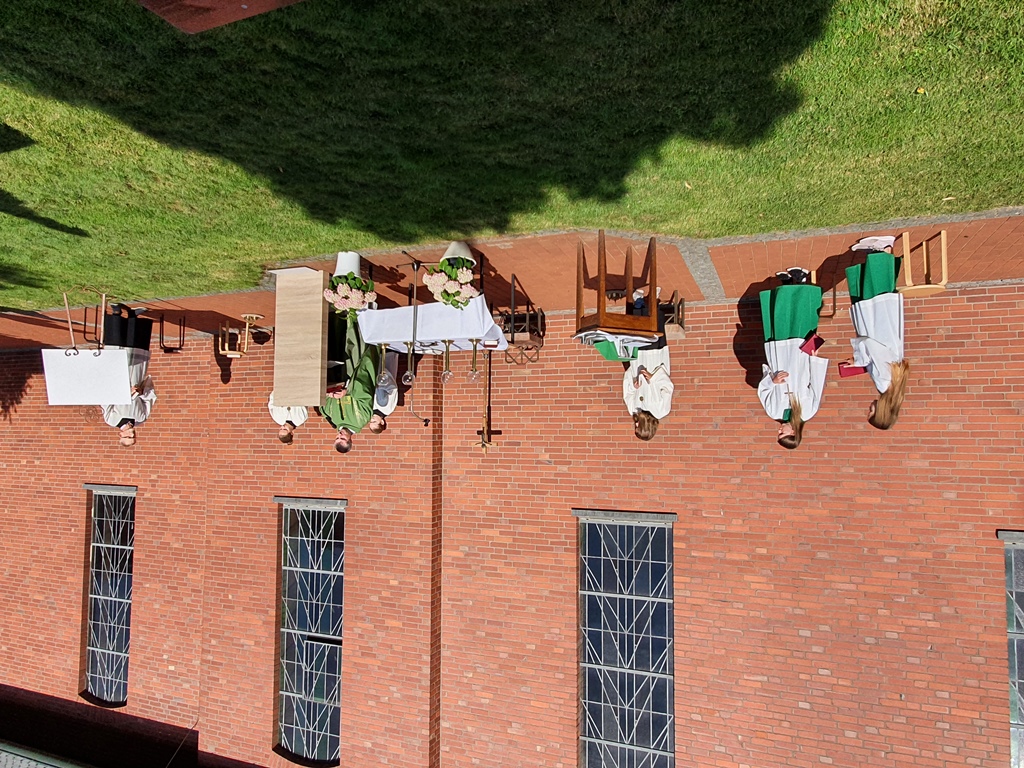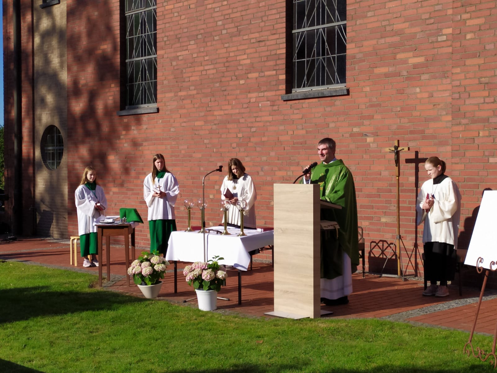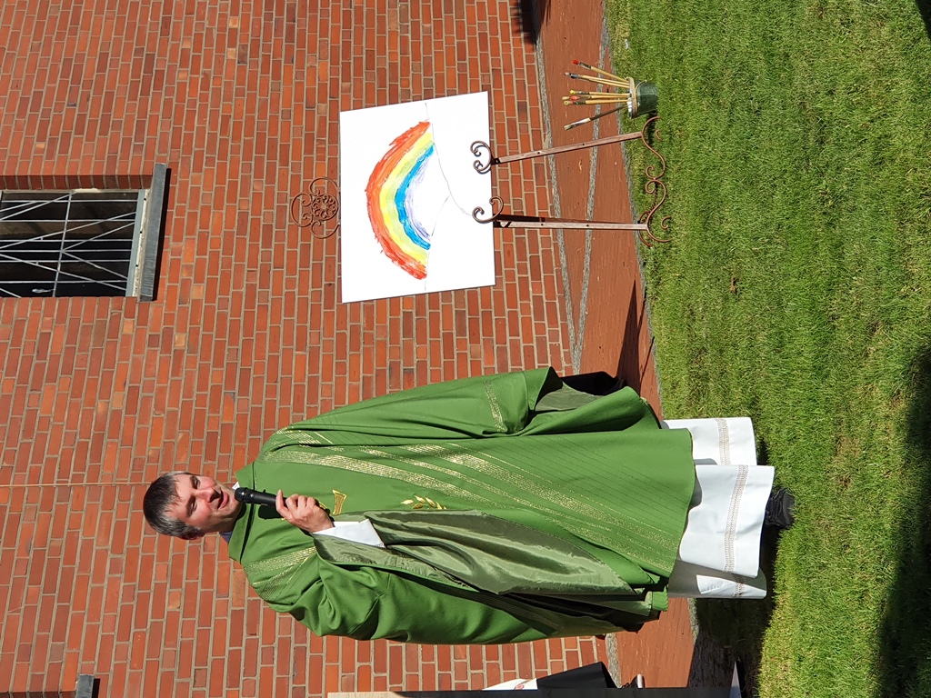 Deshalb haben wir zu einem Open-Air-Familien-Gottesdienst eingeladen und freuen uns, dass ca. 120 Gemeindemitglieder unserer Einladung gefolgt sind. Bei strahlendem Sonnenschein und unter blauen Himmel konnten wir mit Pastor Tietje den Gottesdienst zum Thema „Farben unseres Glaubens“ draußen vor unserer Kirche feiern. Die inhaltliche Vorbereitung und Gestaltung wurde vom Familienmesskreis übernommen und musikalisch hat Herr Hölscher den Gottesdienst begleitet.