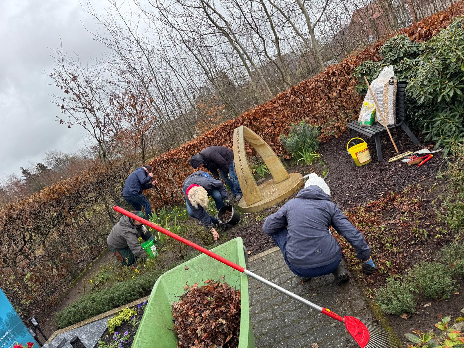 Eine Gruppe Ehrenamtlicher kümmert sich um die Pflege dieses Ortes.
